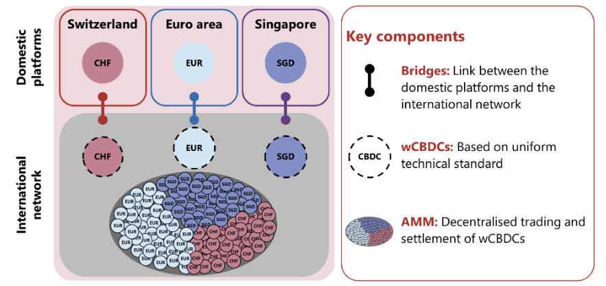 Liquidity of stablecoins, US dollars, and local currencies. Visa and Mastercard should have no problem obtaining liquidity for USDC and dollars from Circle, but the liquidity between USDC and other local currencies is another problem. If liquidity is insufficient, slippage increases and costs rise. Of course, people could first exchange for USD before converting to other local currencies, but this again involves traditional financial institutions. Another approach is direct exchange between local currencies and USDC, or each local currency could have on-chain direct blockchain settlement, while on-chain local currency liquidity could potentially be provided through DeFi. The Bank for International Settlements (BIS), often referred to as the "central bank of central banks," is working on Project Mariana, which shares similar concepts. The project shows how EUR, CHF, and SGD provide liquidity through an AMM model.