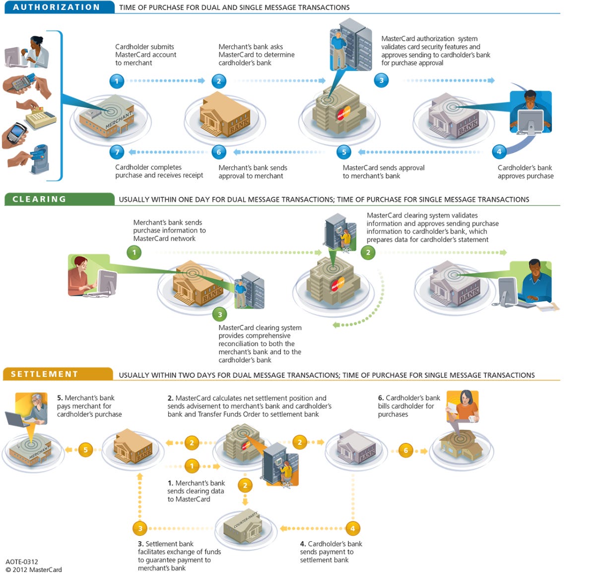 For reference, a credit card transaction goes through three stages: