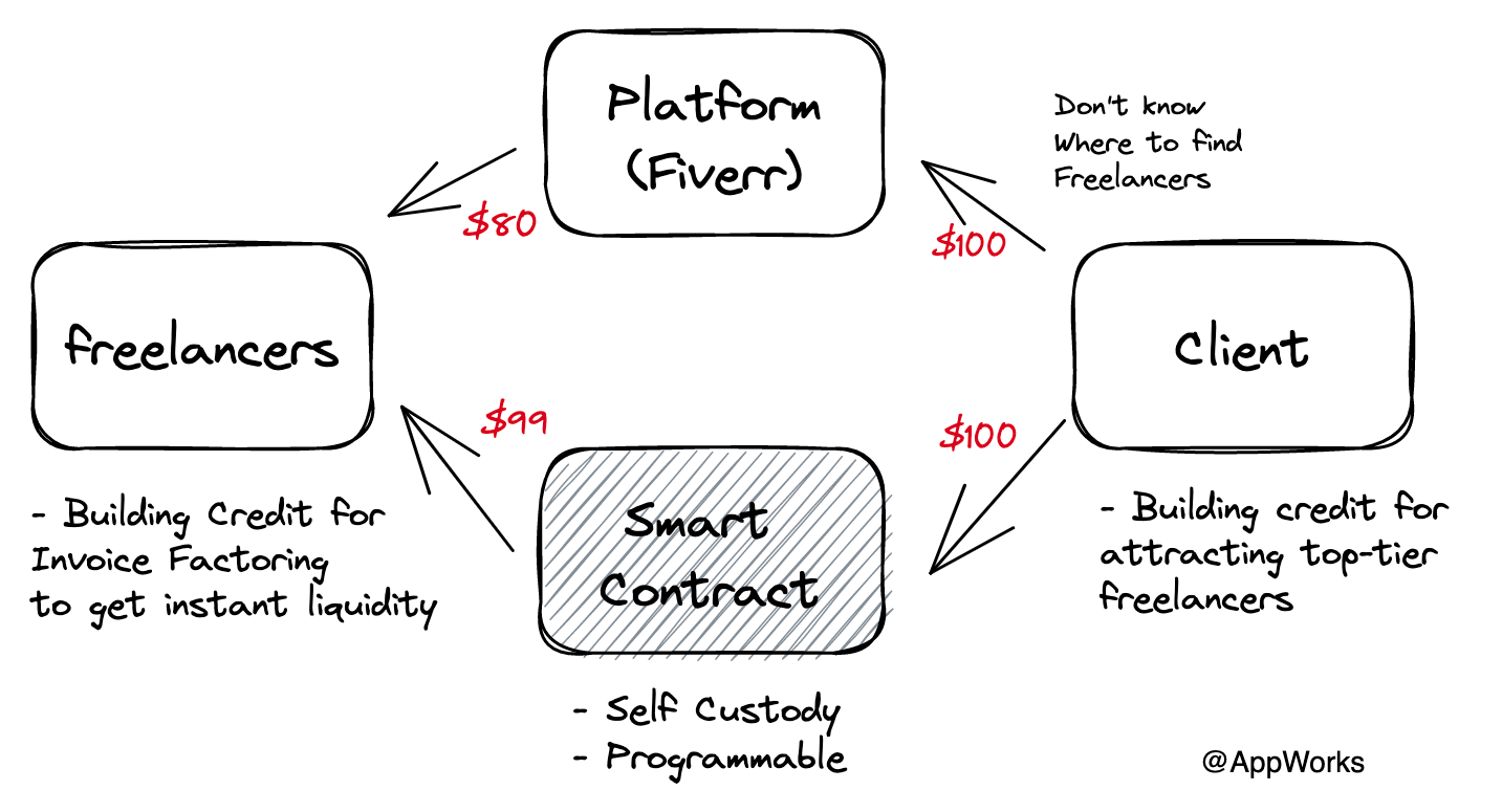 Blockchain can reduce the cost of payment agreements, lower execution cost and escrow fees through smart contracts, and even improve execution efficiency through automatic execution via oracles. In addition, blockchain can create a portable reputation system for freelancers that is closely linked to financial information and business information, and this data can be utilized for financial services in the future.
